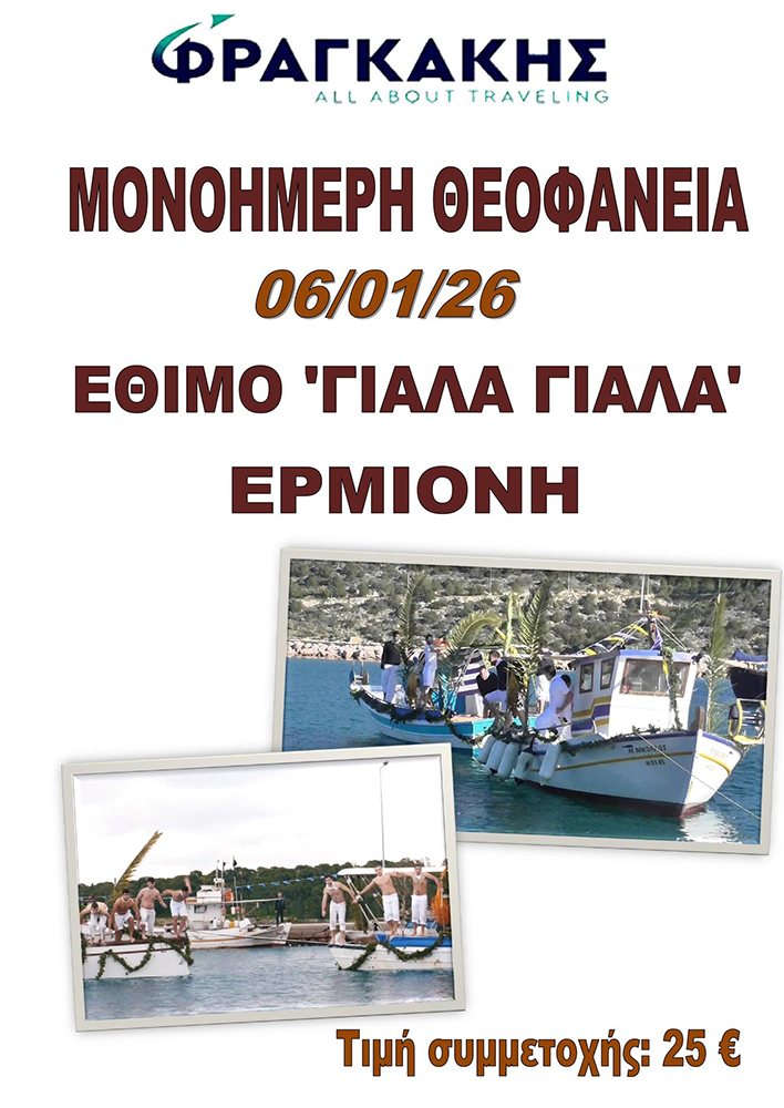 Αναχωρούμε 07:30 από το γραφείο μας, κάνοντας μια ενδιάμεση στάση για καφέ κοντά στον Ισθμό της Κορίνθου. Κατόπιν κατευθυνόμαστε για την πιο γραφική χερσόνησο της Αργολίδας, την Ερμιόνη. Εκεί θα παρακολουθήσουμε το έθιμο των Θεοφανείων Γιάλα Γιάλα. Σύμφωνα με αυτό, τα ξημερώματα των Φώτων οι νέοι στολίζουν τις βάρκες με εορταστικά σημαιάκια και κλώνους από φοινικιές και τραγουδούν το «Γιάλα γιάλα». Φορώντας παραδοσιακές στολές γυρνούν από σπίτι σε σπίτι και δέχονται κεράσματα. Ανήμερα συνεχίζουν το τραγούδι με τον καθαγιασμό των υδάτων. Το μεσημεριανό μας θα το πάρουμε σε ένα από τα μαγαζάκια της περιοχής. Θα επιστρέψουμε στην Αθήνα με μια ενδιάμεση για τον απογευματινό μας καφέ στην Παλαιά Επίδαυρο.